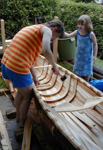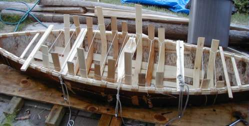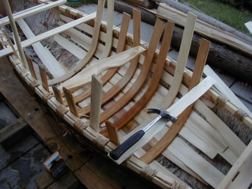 the canoe was covered with sheathing I began putting the ribs loosely in place.