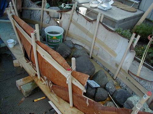In the picture (click on it to see it bigger) you can see the main piece of bark bent upwards and held in place by the stakes in holes in the building platform. For each stake there is a matching stake on the inside that is wedged against the form at the bottom and tied to the outer stake at the top. You can see where I have added extra pieces of bark as needed on the sides. I have used scrap strips of cedar to hold the bark in place.