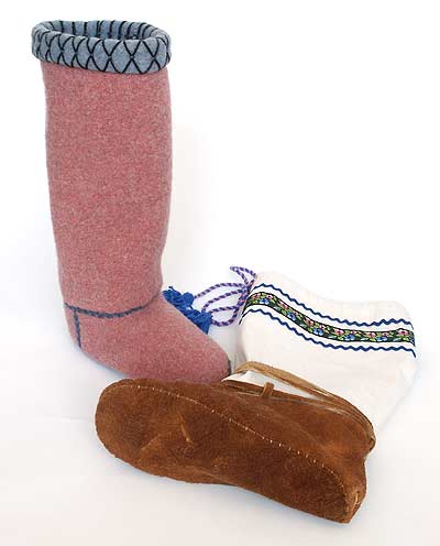 Traditional mukluks in a women's size 7 to 8 that are great for snowshoeing or wearing around the house. The bottoms are smoked moosehide and the tops are canvas with braid trim and wool ties. 100% wool duffle liners that are hand washable. Some of the warmest footwear you will ever wear. Double moosehide soles for extra long wear. These mukluks are suitable for wearing around the house or in cold snow, but not for city wear on hard pavement or wet weather. They are not waterproof but they are excellent for snowshoeing as the smoked moosehide bottoms are much more breathable than commercially tanned leather or rubber boots. Your feet will never be wet from sweating. |