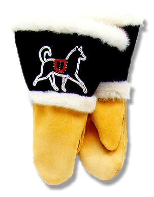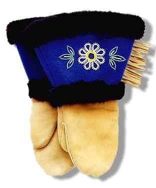 I wear these mittens, made of deerhide and blue wool with black fox fur trim.