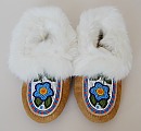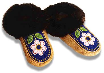 These moccasins were made by Mary Sassie Sr. and marketed by Acho Dene Native Crafts of Fort Liard in the Northwest Territories. They are 8 1/2 inches long and are made of smoked moosehide with blue wool cuffs around the heels and beaver fur trim. I bought them from the Snow Goose gallery in Ottawa. |