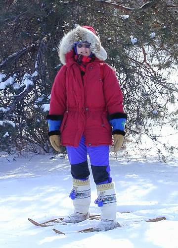 I finally got around to making myself a pair of snowshoe mukluks and I really can't tell you how nice they are to snowshoe in. They have brain-tanned smoked moosehide bottoms, canvas tops, thick duffle liners, felt insoles, braid for decoration and wool ties. I tend to get cold feet outside but these mukluks are so warm and comfy they feel like clouds on my feet. Wearing them outside in the snow feels like I am barefoot because they are so light and have soft soles. At the same time my feet are cozy and warm. I also wear them inside the house too. Because they are made of natural breathable materials they are not too warm even inside the house. You can see a picture of me snowshoeing on a cold day. |