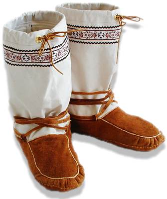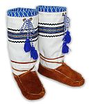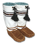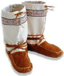 ![]() | Mukluk # 45 This is a pair of traditional snowshoe mukluks ready for winter. They are a men's size 10-10 1/2, made with brain-tanned smoked moosehide bottoms, canvas tops, braid trim, hand braided wool ties, washable wool duffle liners and felt insoles. Both warm and light, they make snowshoeing a delight. See a photo of the duffle liners. |
