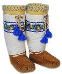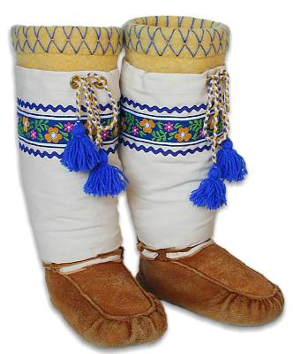 Martin in Ottawa ordered these mukluks in the summer but didn't want to wait until winter to wear them. They have moosehide bottoms and deerhide tops with braid trim and beaded bear paw prints. They have wool duffle liners. |