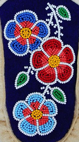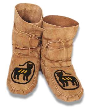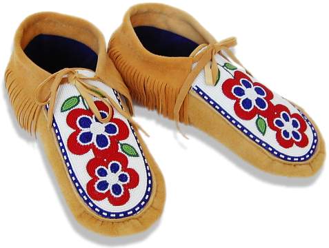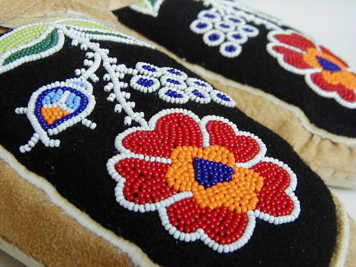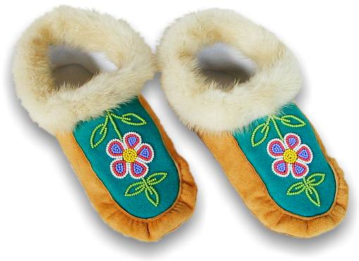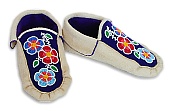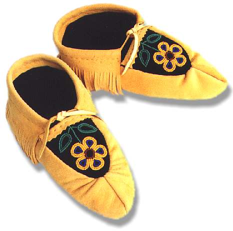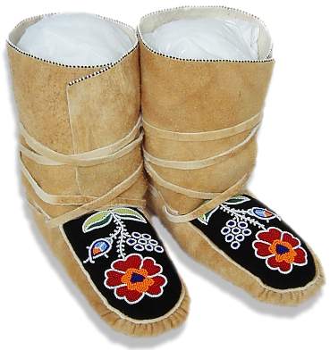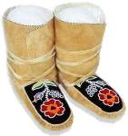 This old fashioned style has a small vamp and pointed toes. They are made of soft deerskin with flowers beaded on black velveteen and fringes around the ankles and are lined with black polar fleece. |