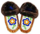 These moccasins are made of smoked brain-tanned moosehide and have beaded flowers on white wool vamps. They are lined with soft blue polar fleece and are trimmed with thick beaver fur. The have now gone to live in Oklahoma. |