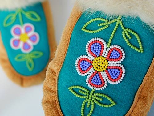 This dainty pair of moccasins is made of very soft elk hide with double soles for durability. They have yellow, coral, light blue and white flowers beaded on blue-green wool and are trimmed with luxurious cream mink fur. They are lined with white polar fleece. See a close-up of the beadwork. |
