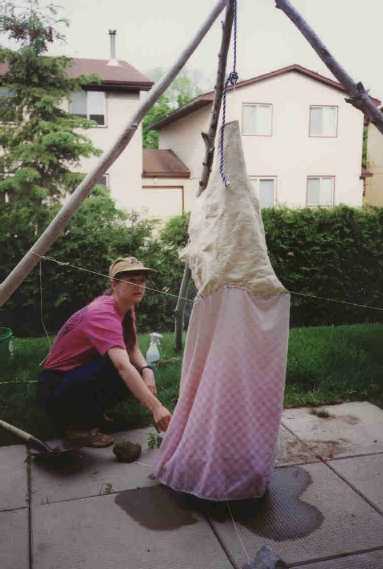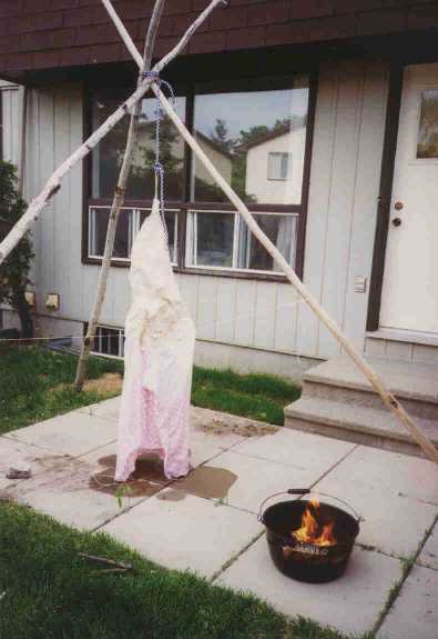 I didn't get around to smoking the hide until June. I sewed the hide into a bag and sewed on extra fabric on the bottom to keep it away from the fire. I hung the hide and fabric bag from a tripod made of 3 poles in the back yard. I built a small fire in an old pot. |